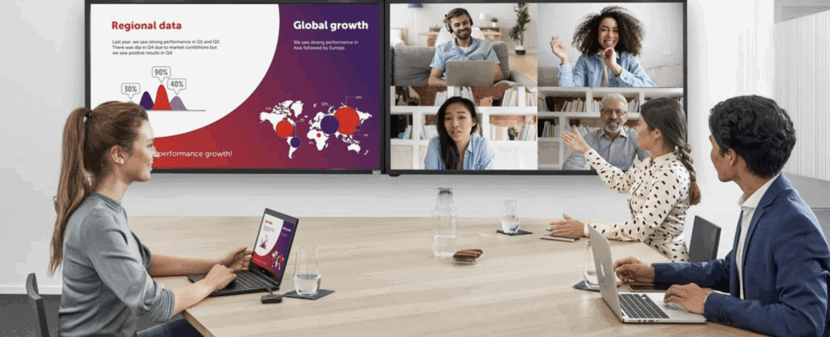 Ein moderner kleiner Besprechungsraum mit Tisch, Laptop und Logitech Videobar unterhalb eines großen Displays, auf dem Präsentationsinhalte kabellos geteilt werden – ideal für Videokonferenzen, Huddle Rooms und hybride Teamarbeit.