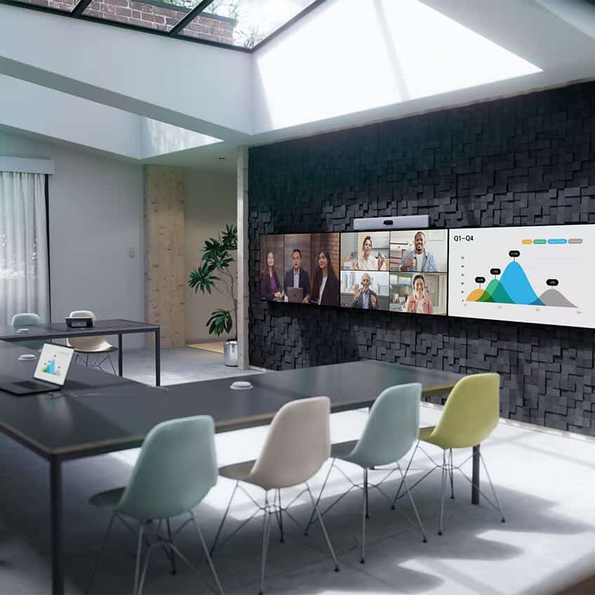 Mit der Cisco Room Bar Pro lassen sich Meetingräume mit minimalem Aufwand modernisieren. Die KI-gesteuerte Kameraführung sorgt für gleichwertige Sichtbarkeit aller Teilnehmenden. Sprachbefehle und Touchpanel bieten komfortable Steuerung. Die 3-Bildschirm-Unterstützung, erweiterbare Mikrofonlandschaft und plattformunabhängige Nutzung machen die Room Bar Pro zur idealen Lösung für flexible Arbeitsumgebungen.