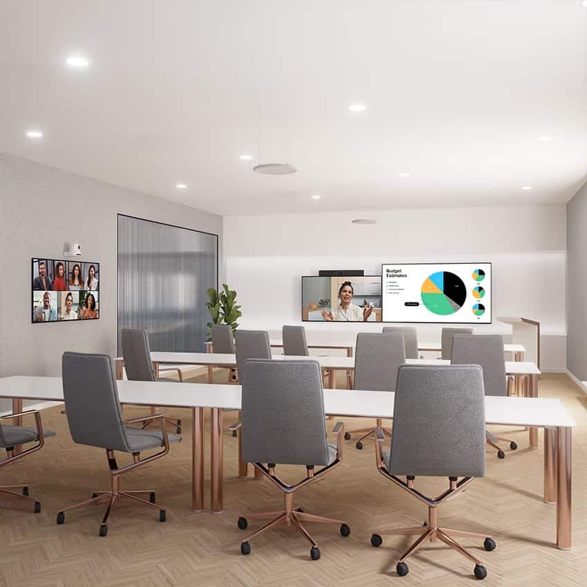 Die PTZ 4K-Kamera wird über das Cisco-System fernbedient und liefert hochwertige Videobilder auch bei großer Raumtiefe. Der Codec EQ verarbeitet Medien mit KI-Unterstützung, während der Room Navigator die Steuerung und Sensorik zentralisiert. HDMI-CEC aktiviert angeschlossene Displays automatisch, USB-C ermöglicht spontane BYOD-Nutzung.