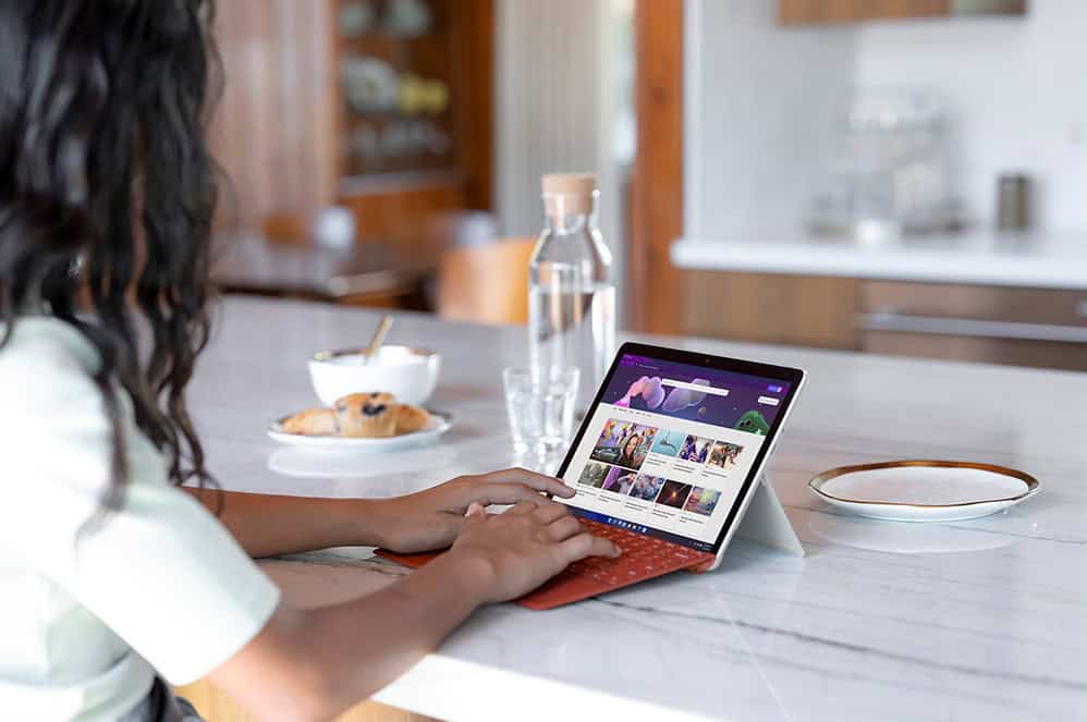 Um jederzeit bequem tippen zu können, koppeln Sie einfach das Surface Go Type Cover mit dem Surface Go 3 (separat bei uns erhältlich). Umfasst eine vollständige Tastatur mit Hintergrundbeleuchtung, optimalem Abstand für schnelles, flüssiges Tippen und einem großzügig dimensioniertes Glas-Trackpad. Erhältlich in den Farben Eisblau, Mohnrot, Platin und Schwarz. Für einen Hauch von Luxus gibt es auch die Möglichkeit aus warmem Alcantara®-Material überzogen (nicht im Lieferumfang enthalten, bitte sprechen Sie uns hierzu an).