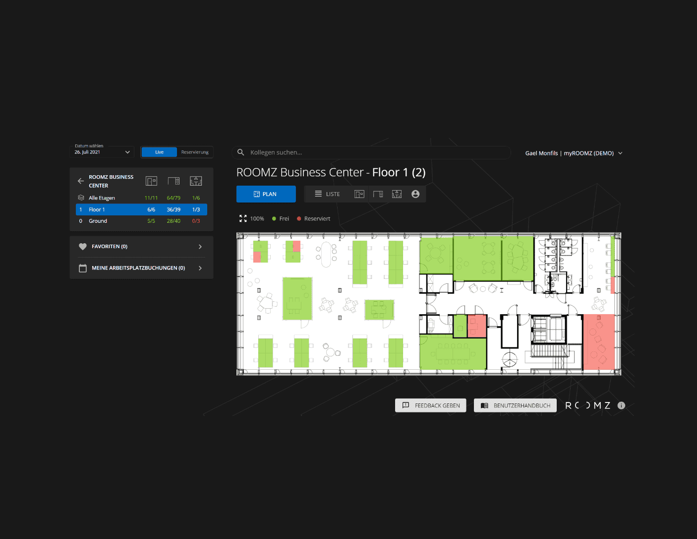 Der digitale Grundriss bietet Ihren Mitarbeitern schnell & effizient Ihren Arbeitsbereich (Schreibtisch oder Huddle Space) zu buchen, zu reservieren oder bei nicht Inanspruchnahme, sofort wieder freizugeben. Die Software-Plattform ist einfach & intuitiv zu bedienen. Die Informationen werden in Echtzeit angezeigt.