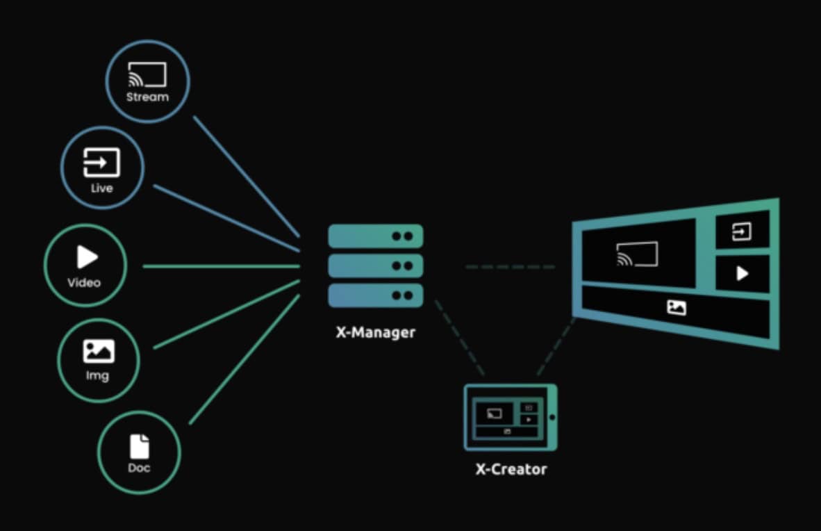 Laden Sie Videos, Bilder, PDFs, 3D Daten und vieles mehr in unseren X-Manager und mischen Sie, in Echtzeit, Ihre digitalen Assets mit Live-Inputs oder IP-Streams.